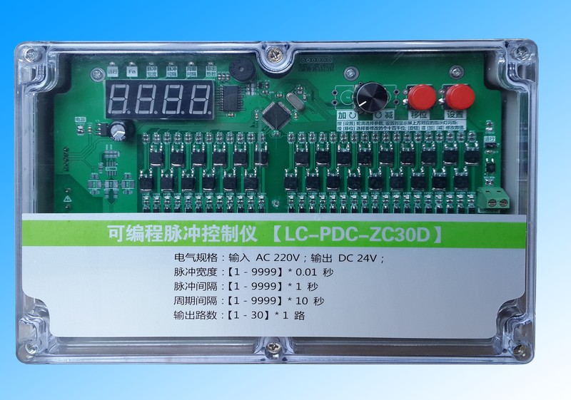 脈沖袋式除塵器控制儀 LC-PDC-ZC30D (在線式 30路 24V),此款控制儀電壓有24V和220V兩款,購買時請告知客服選用電壓,以免為您造成不必要的損失。此款脈沖控制儀輸出路數可調,凡是所控脈沖閥數量為30個以下,全部可以使用。