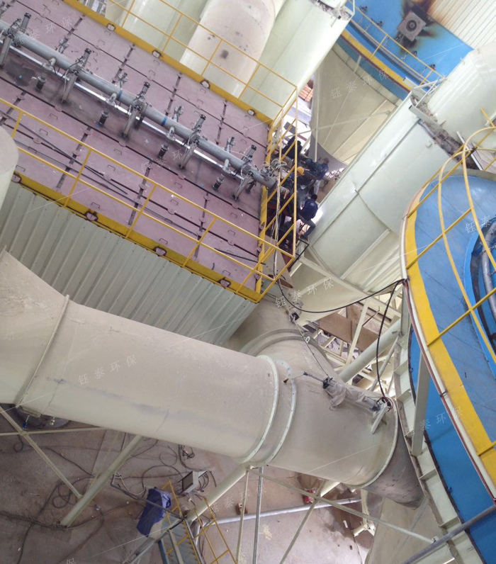 噴霧干燥塔除塵器采用高溫針剌氈濾料作為過濾材料,透氣性能強,除塵效率高。采用反吹除塵法,不僅能凈化一般的含塵硫氣體,還能處理入口濃度達1300g/Nm3的含塵氣體。煙氣中所含的水蒸氣由于其溫度較高,在100℃左右,初呈氣態;從噴霧塔出來后,溫度有所降低,冷凝成水滴附在煙氣中的塵粒上,呈現霧狀;進入氣箱脈沖袋除塵器時塵粒即被捕集下來。