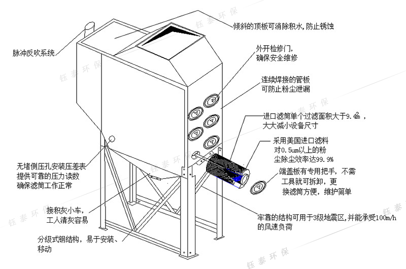 2.1、設備外型結構特點:整體結構嚴密,連續焊接的管板可防止粉塵的泄露。設備機體采用酸洗除銹,底漆、面漆采用環氧漆噴涂,環氧漆附著力強,涂膜柔韌耐磨,耐化學腐蝕性能優良,有極好的耐水、耐油、耐酸堿、耐溶劑性。