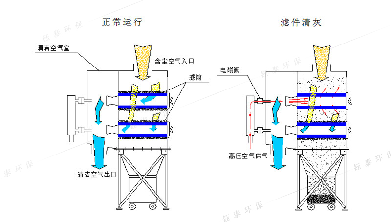 濾筒除塵器的主要構造是由除塵室、脈沖反吹清灰系統和集塵室組成。當含塵空氣進入除塵室后,被圓筒形的濾筒材質阻隔,亞微米以上的粉塵被阻留在濾筒外表面上,過濾凈化后的氣流就從濾筒